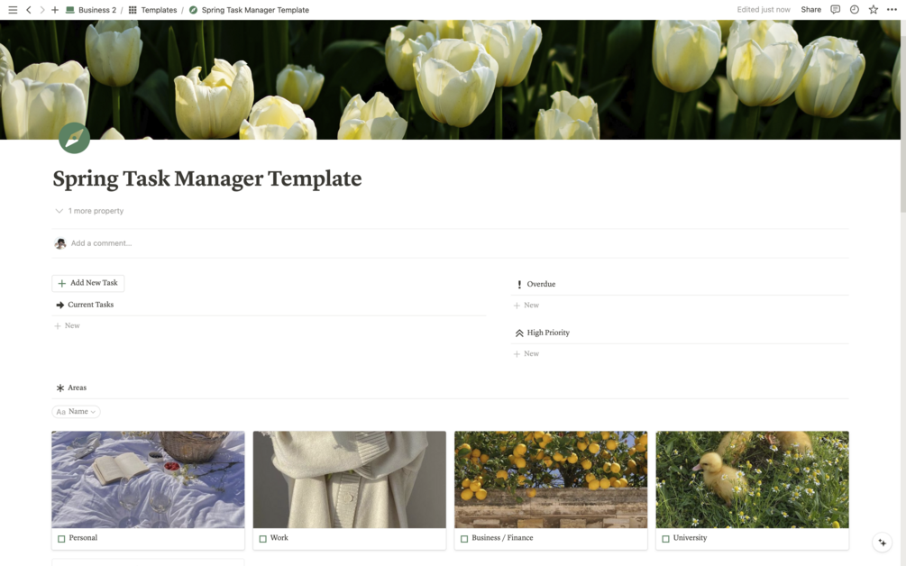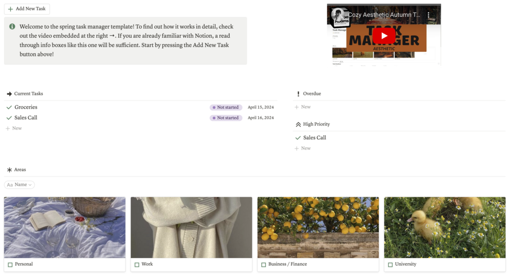 Stay on top of your tasks with this ready-to-use Notion Task Manager. Keep track of all areas of your life in one place, with an aesthetic design and easy-to use interface. Features include: